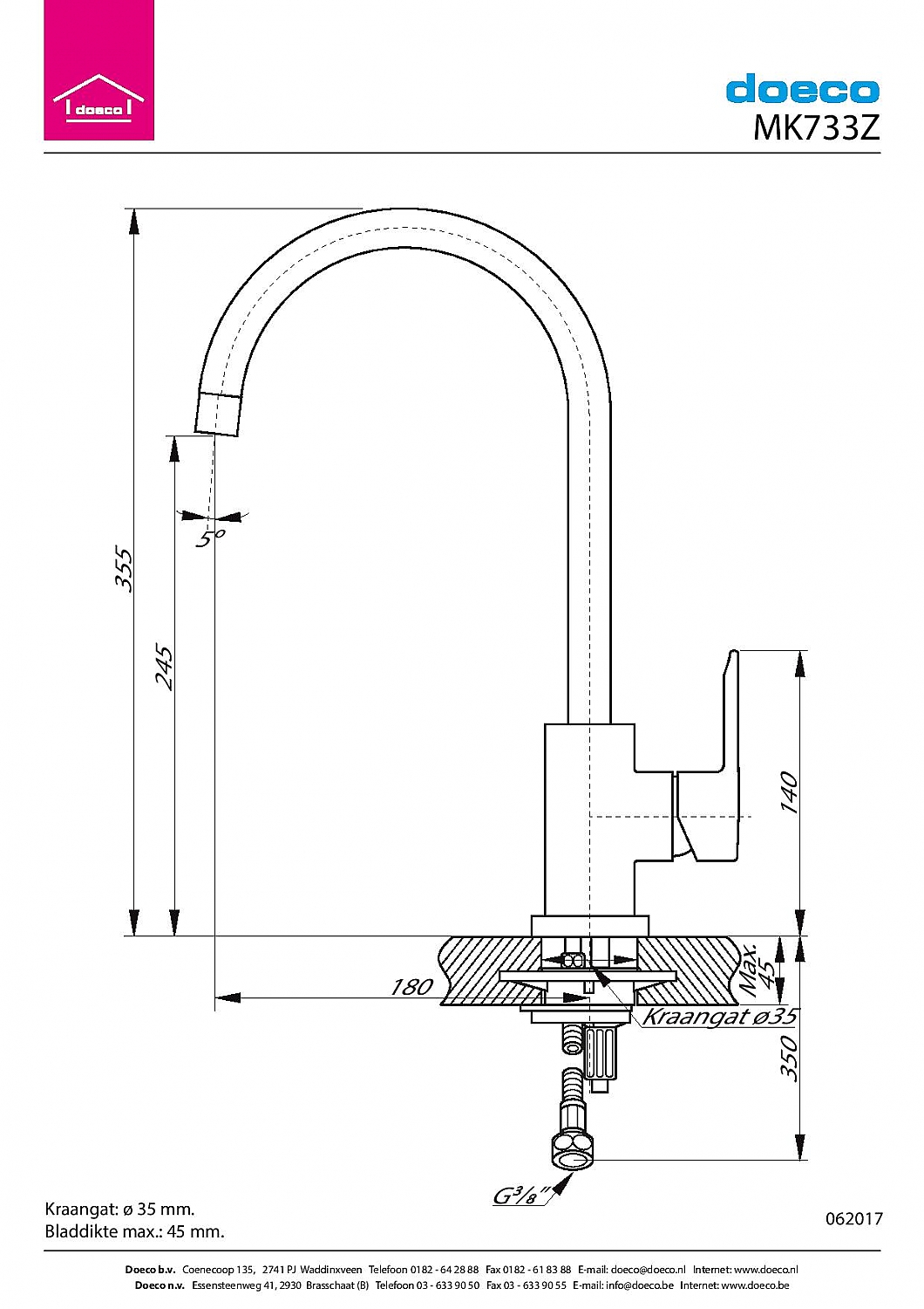 Deze kraan monteer je in een standaard kraangat van 35 mm en hij is geschikt voor werkbladen tot 45 mm dik. Voor de montage heb je meestal alleen een steeksleutel, een waterpomptang en wat PTFE-tape nodig om alles netjes waterdicht aan te sluiten.