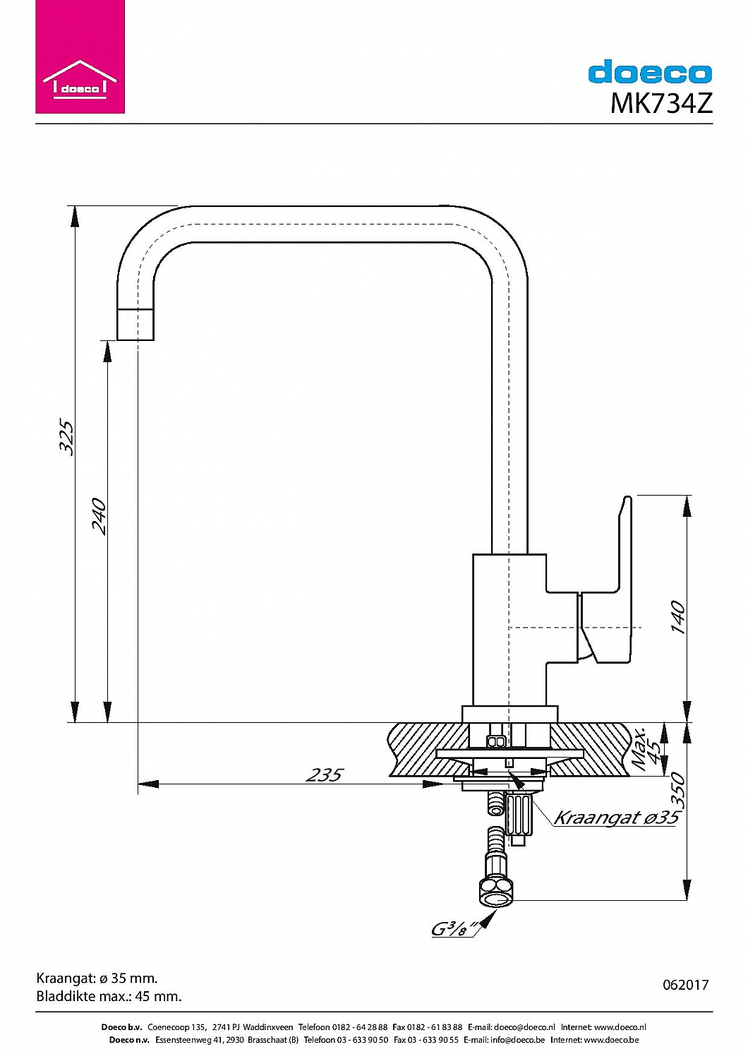 Deze kraan monteer je in een standaard boorgat van 35 mm. Je hebt hiervoor een steeksleutel en een waterpomptang nodig om de aansluiting netjes vast te zetten. Controleer vooraf of je werkblad niet dikker is dan 45 mm.