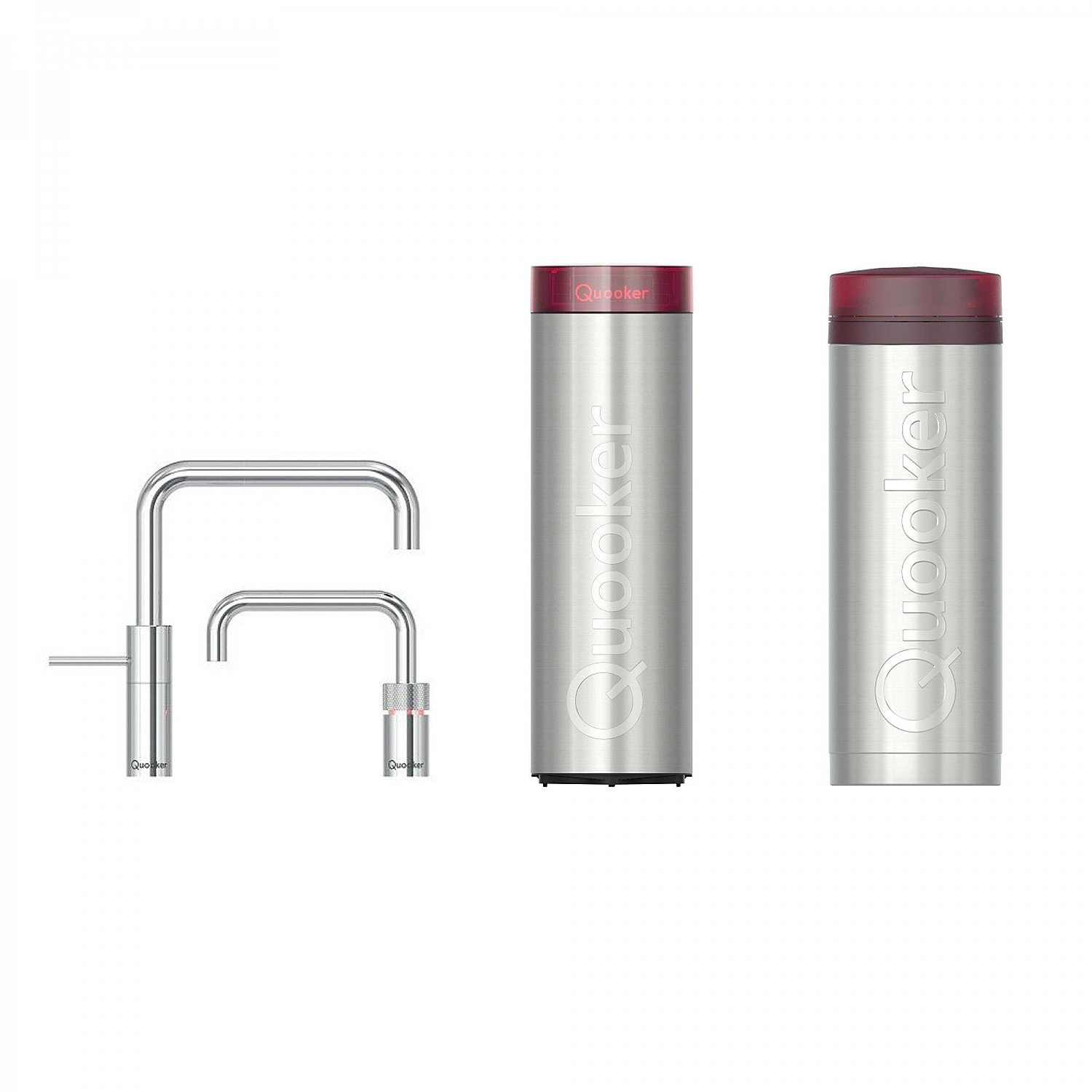 Quooker Cube Nordic Twintaps square chroom met Pro3 reservoir is een complete Quooker set met twee kranen: een keukenmengkraan voor koud en warm water en een aparte Quooker kraan voor kokend, gekoeld en bruisend water. Deze Nordic Twintaps square uitvoering heeft een strakke vierkante uitloop en een glanzende chroomafwerking. Het Pro3 reservoir levert 3 liter kokend water en de Quooker Cube zorgt voor gekoeld en bruisend water uit dezelfde kraan.