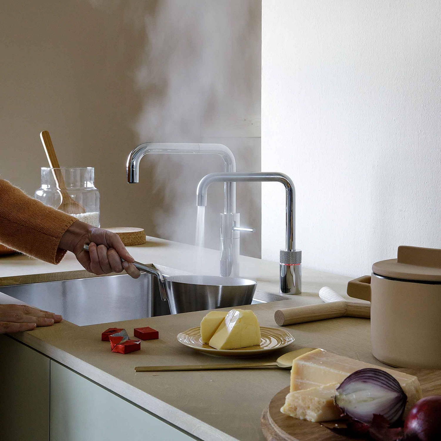 Deze Nordic Twintaps in square vorm schaf je aan wanneer het design van deze kranen u bevalt en wanneer u een losse keukenmengkraan en een losse kokendwaterkraan op het aanrechtblad wilt hebben. De kokendwaterkraan is in hoogte verstelbaar zodat u deze zo praktisch mogelijk kunt gebruiken. Ook is het mogelijk deze set te combineren met Quooker Cube voor ook koel bruisend en gefilterd water.Functionaliteiten