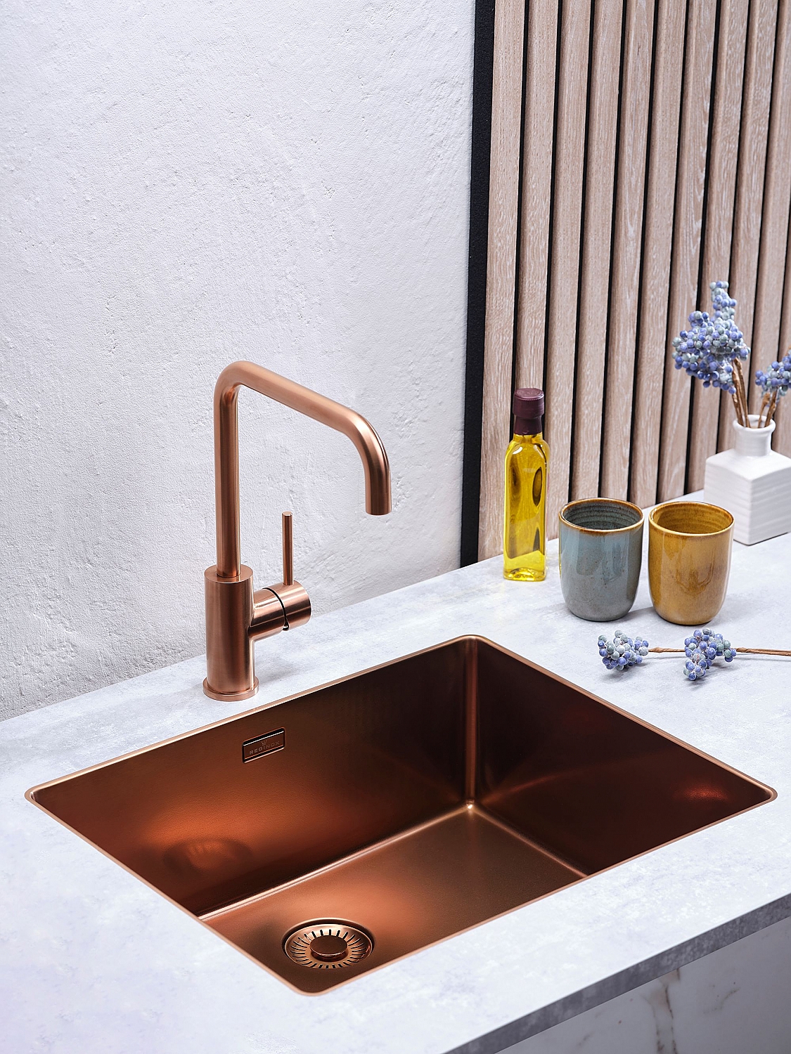 Een copper spoelbak geeft de keuken een luxe uitstraling en combineert goed met zwarte of messing keukenkranen.