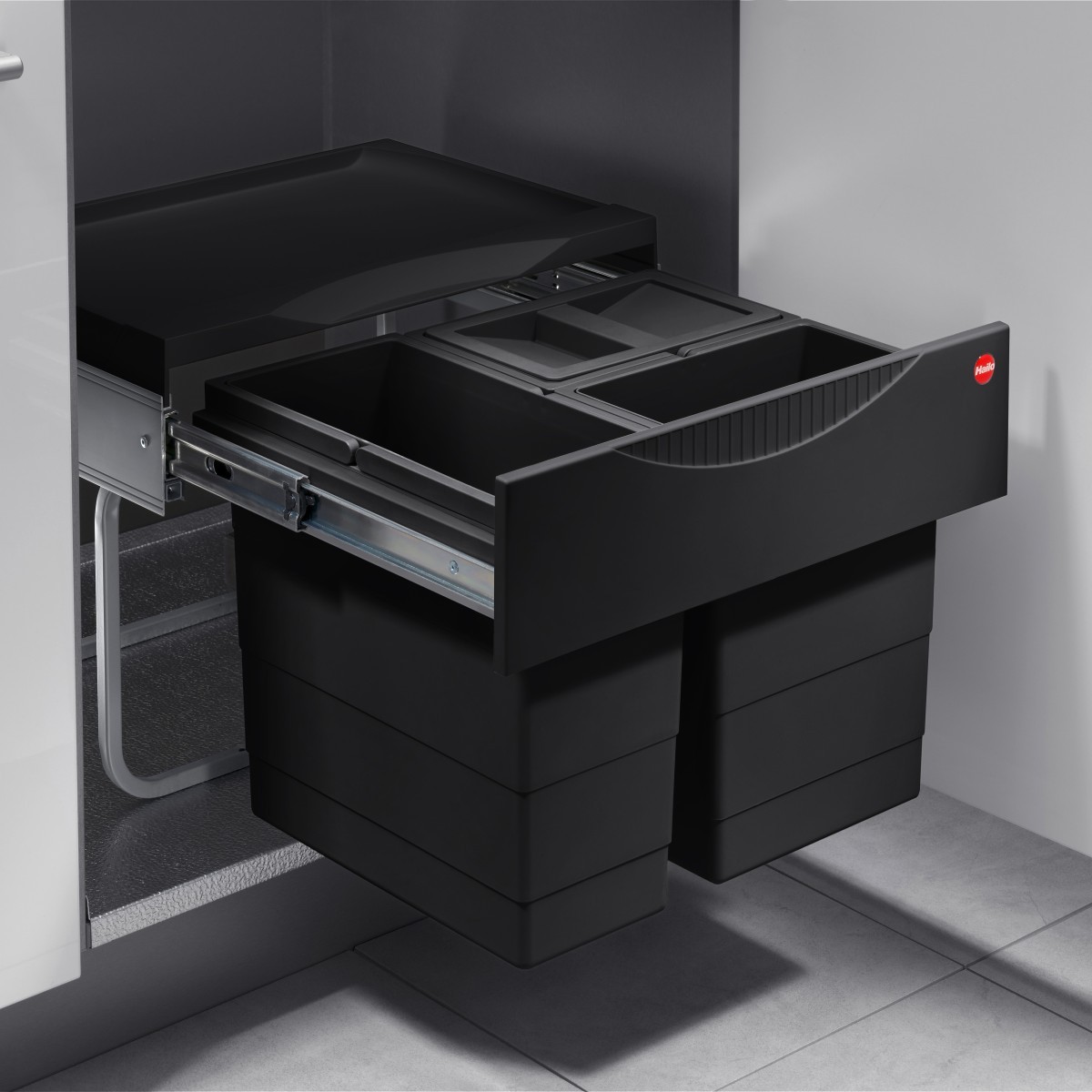 Het Hailo Tandem S voluittrek afvalsysteem 28 liter is een ruimtebesparende inbouwoplossing voor draaideurkasten. Dit model is volledig uittrekbaar en uitgevoerd met drie bakken, waardoor je afval overzichtelijk kunt scheiden zonder veel kastruimte te verliezen. Gemaakt van gerecycled kunststof en ontworpen voor dagelijks gebruik.